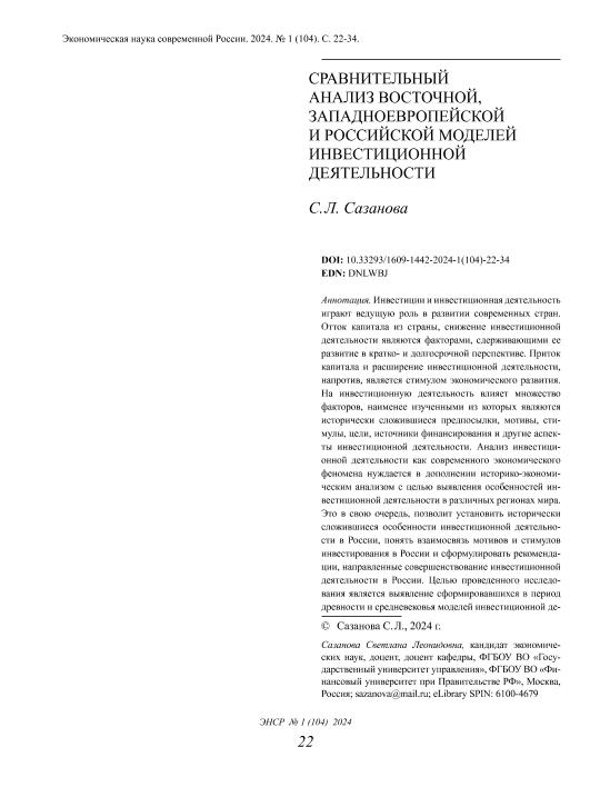 Сазанова, С.Л. Сравнительный анализ восточной, западноевропейской и российской моделей инвестиционной деятельности // Экономическая наука современной России. – 2024. – № 1. — С. 22-34. — Только в электронном виде. — <URL:http://elib.fa.ru/art2024/bv3909.pdf>.