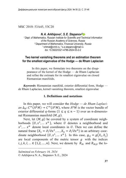 Arkhipova N. A. (Архипова Н.А.). Two kernel vanishing theorems and an estimation theorem for the smallest eigenvalue of the Hodge — de Rham Laplacian = Две теоремы исчезновения и теорема оценки наименьшего собственного значения лапласиана Ходжа — де Рама / Arkhipova N. A. (Архипова Н.А.), Stepanov S. E. (Степанов С.Е.) // Дифференциальная геометрия многообразий фигур. – 2024. – № 2. — С. 37-46. — Только в электронном виде. — <URL:http://elib.fa.ru/art2024/bv3586.pdf>.