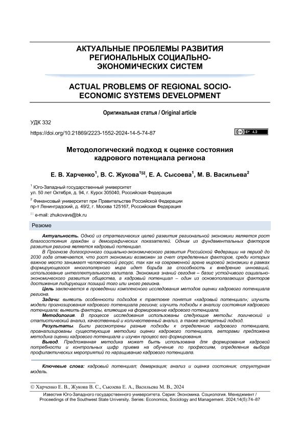 Методологический подход к оценке состояния кадрового потенциала региона / Е.В. Харченко, В.С. Жукова, Е.А. Сысоева, М.В. Васильева // Известия Юго-Западного государственного университета. Серия: Экономика. Социология. Менеджмент. – 2024. – № 5. — С. 74-87. — Только в электронном виде. — <URL:http://elib.fa.ru/art2024/bv3592.pdf>.