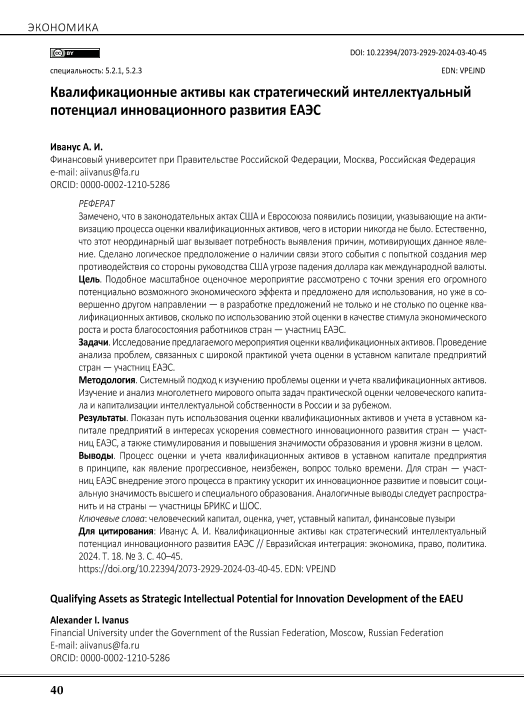 Иванус, А.И. Квалификационные активы как стратегический интеллектуальный потенциал инновационного развития ЕАЭС // Евразийская интеграция: экономика, право, политика. – 2024. – № 3. — С. 40-45. — Только в электронном виде. — <URL:http://elib.fa.ru/art2024/bv3601.pdf>.