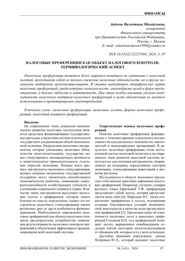 Авдеева, В.М. Налоговые преференции как объект налогового контроля: терминологический аспект // Инновационное развитие экономики. – 2024. – № 3. — С. 97-102. — Только в электронном виде. — <URL:http://elib.fa.ru/art2024/bv3632.pdf>.