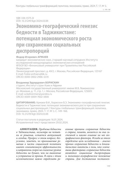 Аржаев, Ф.И. Экономико-географический генезис бедности в Таджикистане: потенциал экономического роста при сохранении