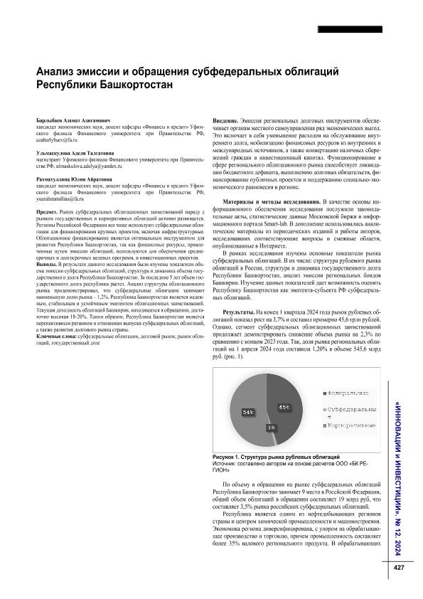 Барлыбаев, А.А. Анализ эмиссии и обращения субфедеральных облигаций Республики Башкортостан / А.А. Барлыбаев, А.Т. Ульмаскулова, Ю.А. Рахматуллина // Инновации и инвестиции. – 2024. – № 12. — С. 427-430. — Только в электронном виде. — <URL:http://elib.fa.ru/art2024/bv3785.pdf>.