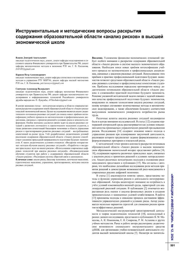 Власов, Д.А. Инструментальные и методические вопросы раскрытия содержания образовательной области «анализ рисков» в высшей