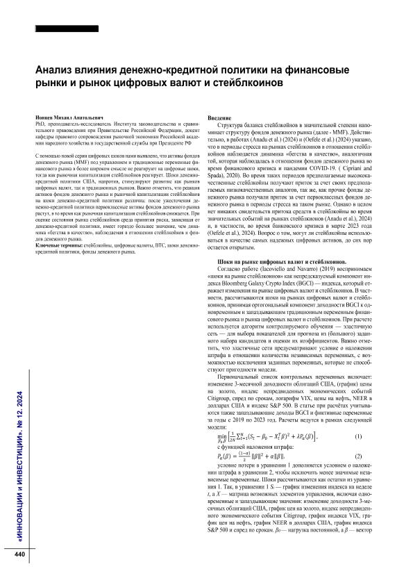 Ионцев, М.А. Анализ влияния денежно-кредитной политики на финансовые рынки и рынок цифровых валют и стейблкоинов // Инновации и инвестиции. – 2024. – № 12. — С. 440-445. — Только в электронном виде. — <URL:http://elib.fa.ru/art2024/bv3802.pdf>.