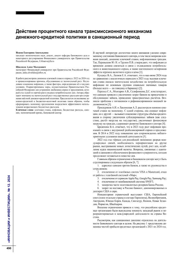Исаева, Е.А. Действие процентного канала трансмиссионного механизма денежного-кредитной политики в санкционный период / Е.А. Исаева, А.М. Швелидзе // Инновации и инвестиции. – 2024. – № 12. — С. 490-494. — Только в электронном виде. — <URL:http://elib.fa.ru/art2024/bv3804.pdf>.
