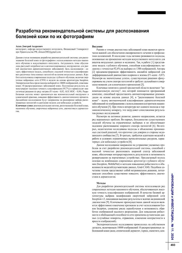 Асеев, Д.А. Разработка рекомендательной системы для распознавания болезней кожи по их фотографиям // Инновации и инвестиции. – 2024. – № 11. — С. 493-496. — Только в электронном виде. — <URL:http://elib.fa.ru/art2024/bv3783.pdf>.