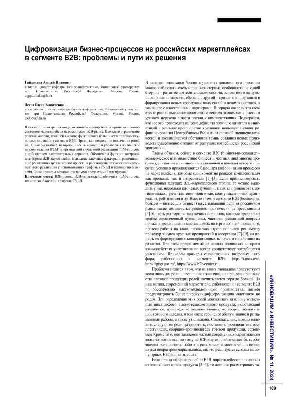 Гайдамака, А.И. Цифровизация бизнес-процессов на российских маркетплейсах в сегменте B2B: проблемы и пути их решения / А.И. Гайдамака, Е.А. Деева // Инновации и инвестиции. – 2024. – № 11. — С. 189-191. — Только в электронном виде. — <URL:http://elib.fa.ru/art2024/bv3793.pdf>.