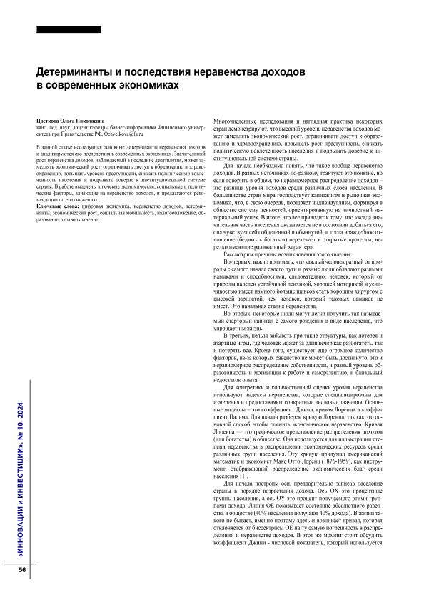 Цветкова, О.Н. Детерминанты и последствия неравенства доходов в современных экономиках // Инновации и инвестиции. – 2024. – № 10. — С. 56-59. — Только в электронном виде. — <URL:http://elib.fa.ru/art2024/bv3678.pdf>.