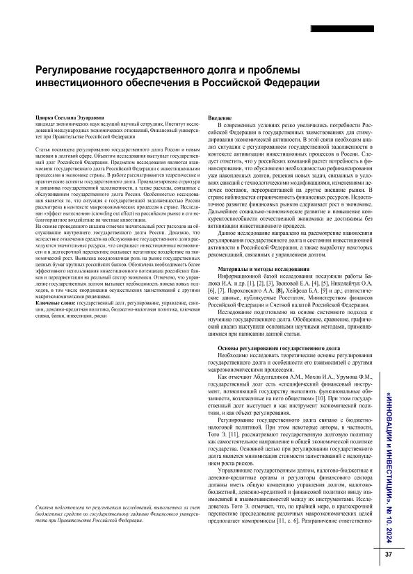Цвирко, С.Э. Регулирование государственного долга и проблемы инвестиционного обеспечения в Российской Федерации // Инновации и инвестиции. – 2024. – № 10. — С. 37-41. — Только в электронном виде. — <URL:http://elib.fa.ru/art2024/bv3679.pdf>.