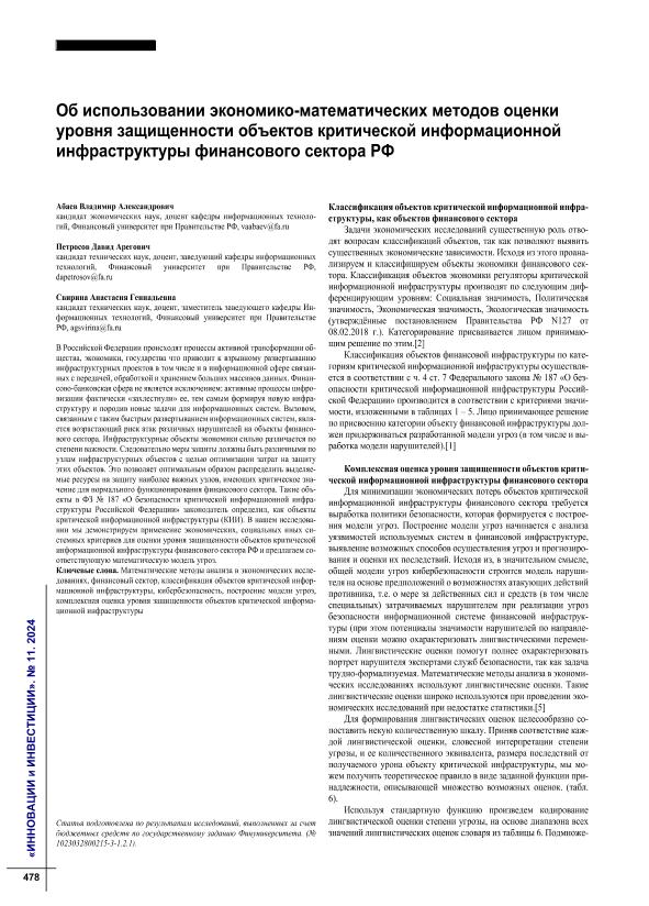 Абаев, В.А. Об использовании экономико-математических методов оценки уровня защищенности объектов критической информационной инфраструктуры финансового сектора РФ / В.А. Абаев, Д.А. Петросов, А.Г. Свирина // Инновации и инвестиции. – 2024. – № 11. — С. 478-482. — Только в электронном виде. — <URL:http://elib.fa.ru/art2024/bv3377.pdf>.