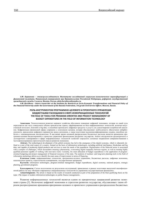 Берникова, А.М. Роль инструментов программно-целевого и проектного управления бюджетными расходами в сфере информационных технологий // Вестник Академии знаний. – 2025. – № 3. — С. 550-554. — Только в электронном виде. — <URL:http://elib.fa.ru/art2025/bv573.pdf>.