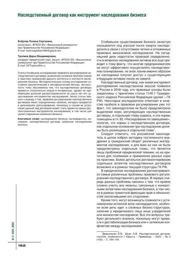 Боброва, П.С. Наследственный договор как инструмент наследования бизнеса / П.С. Боброва, Д.В. Тропина // Юридическая наука. – 2025. – № 5. — С. 162-164. — Только в электронном виде. — <URL:http://elib.fa.ru/art2025/bv574.pdf>.