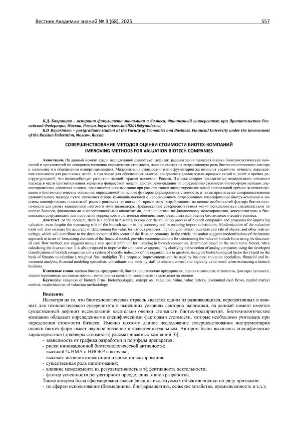 Бояринцев, К.Д. Совершенствование методов оценки стоимости биотех-компаний // Вестник Академии знаний. – 2025. – № 3. — С. 557-560. — Только в электронном виде. — <URL:http://elib.fa.ru/art2025/bv575.pdf>.