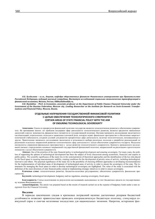 Буздалина, О.Б. Отдельные направления государственной финансовой политики с целью обеспечения технологического суверенитета // Вестник Академии знаний. – 2025. – № 3. — С. 560-563. — Только в электронном виде. — <URL:http://elib.fa.ru/art2025/bv576.pdf>.