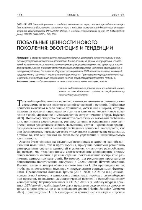 Василенко, С.Б. Глобальные ценности нового поколения: эволюция и тенденции // Власть. – 2025. – № 5. — С. 184-190 — <URL:http://elib.fa.ru/art2025/bv579.pdf>.