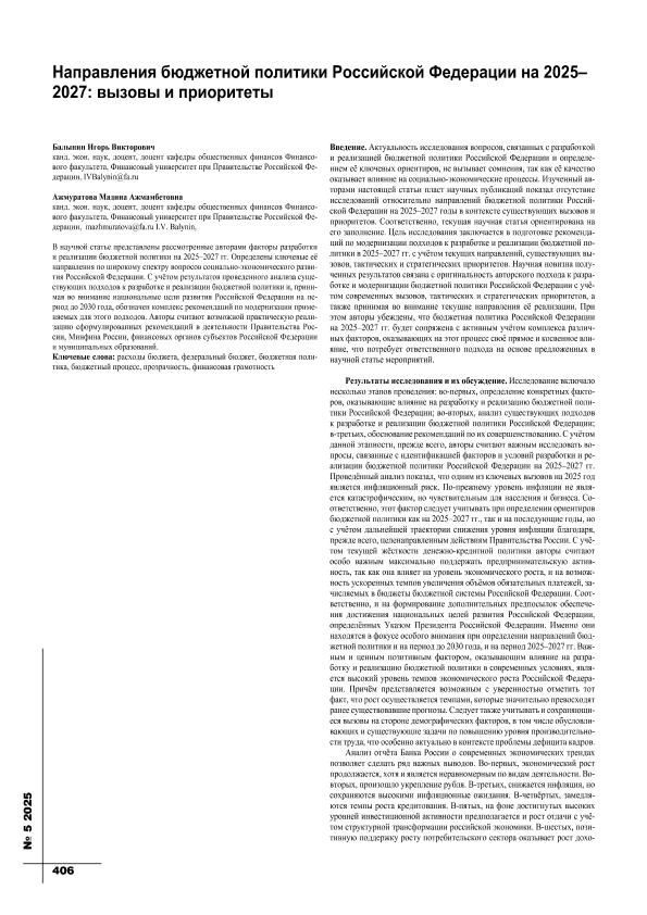 Балынин, И.В. Направления бюджетной политики Российской Федерации на 2025–2027: вызовы и приоритеты / И.В. Балынин, М.А. Ажмуратова // Экономика строительства. – 2025. – № 5. — С. 406-409. — Только в электронном виде. — <URL:http://elib.fa.ru/art2025/bv570.pdf>.