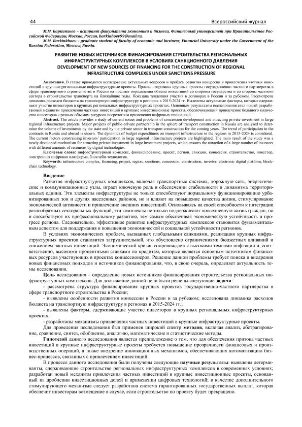 Баркинхоев, М.М. Развитие новых источников финансирования строительства региональных инфраструктурных комплексов в условиях санкционного давления // Вестник Академии знаний. – 2025. – № 3. — С. 44-50. — Только в электронном виде. — <URL:http://elib.fa.ru/art2025/bv571.pdf>.