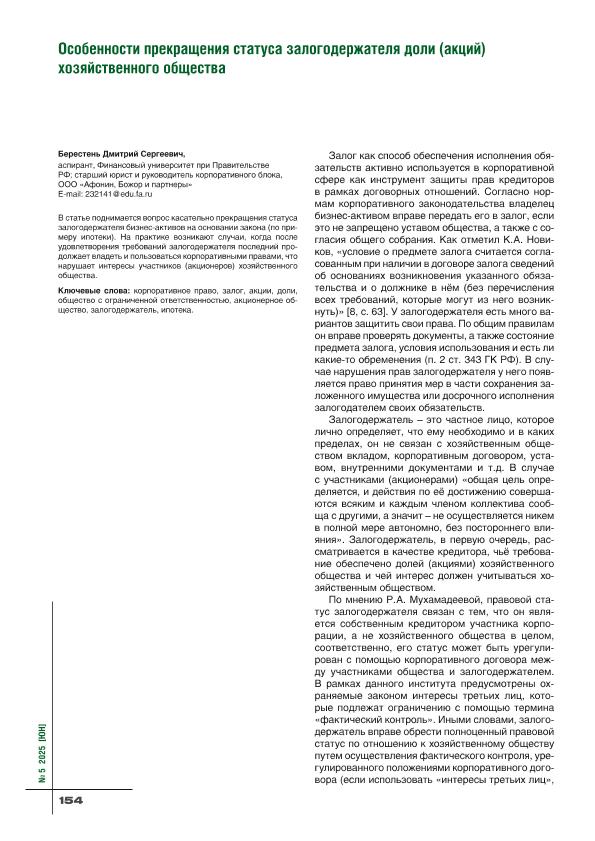 Берестень, Д.С. Особенности прекращения статуса залогодержателя доли (акций) хозяйственного общества // Юридическая наука. – 2025. – № 5. — С. 154-157. — Только в электронном виде. — <URL:http://elib.fa.ru/art2025/bv572.pdf>.