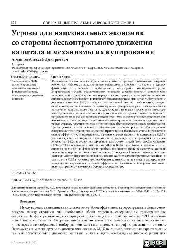 Архипов, А.Д. Угрозы для национальных экономик со стороны бесконтрольного движения капитала и механизмы их купирования. — Текст: электронный // Теоретическая экономика. – 2024. – № 11. — С. 124-135. - URL: http://www.theoreticaleconomy.ru. - Дата публикации: 30.11.2024 — <URL:http://elib.fa.ru/art2024/bv3920.pdf>.