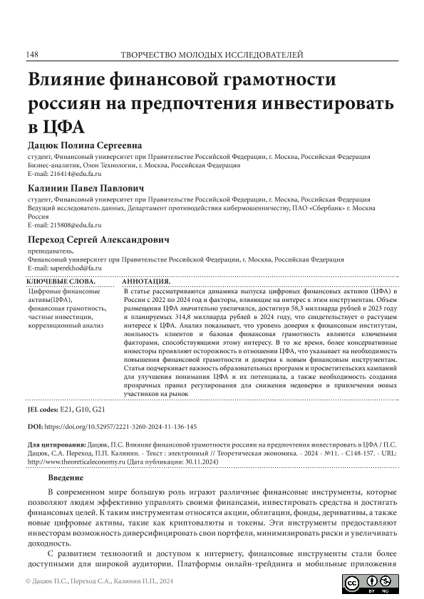 Дацюк, П.С. Влияние финансовой грамотности россиян на предпочтения инвестировать в ЦФА / П.С. Дацюк, П.П. Калинин, С.А. Переход. — Текст: электронный // Теоретическая экономика. – 2024. – № 11. — С. 148-157. - URL: http://www.theoreticaleconomy.ru. - Дата публикации: 30.11.2024 — <URL:http://elib.fa.ru/art2024/bv3933.pdf>.