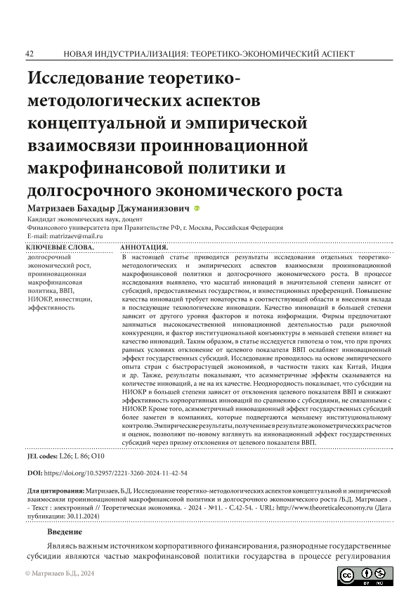 Матризаев, Б.Д. Исследование теоретико-методологических аспектов концептуальной и эмпирической взаимосвязи проинновационной макрофинансовой политики и долгосрочного экономического роста. — Текст: электронный // Теоретическая экономика. – 2024. – № 11. — С. 42-54. - URL: http://www.theoreticaleconomy.ru. - Дата публикации: 30.11.2024 — <URL:http://elib.fa.ru/art2024/bv3957.pdf>.