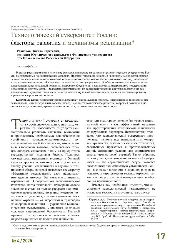 Радионов, Н.С. Технологический суверенитет России: факторы развития и механизмы реализации // Безопасность бизнеса. – 2025. – № 4. — С. 17-21. — Хранение - Кибальчича, 1. — <URL:http://elib.fa.ru/art2025/bv1274.pdf>.