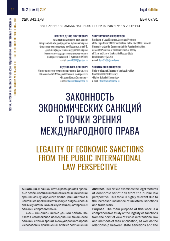 Шепелев Д.В. Законность экономических санкций с точки зрения международного права / Шепелев Д.В., Шустов Г.О. // Legal Bulletin. – 2021. – № 2.-С.47-54. — Только в электронном виде. — <URL:http://elib.fa.ru/art2021/bv3612.pdf>.