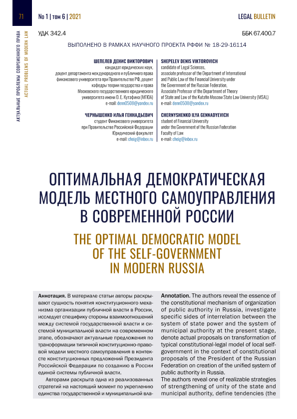 Шепелев Д.В. Оптимальная демократическая модель местного самоуправления в современной России / Шепелев Д.В., Чернышенко И.Г. // Legal Bulletin. – 2021. – № 1.-С.71-79. — Только в электронном виде. — <URL:http://elib.fa.ru/art2021/bv3613.pdf>.