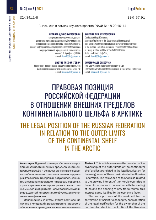 Шепелев Д.В. Правовая позиция Российской Федерации в отношении внешних пределов континентального шельфа в Арктике / Шепелев Д.В., Шустов Г.О. // Legal Bulletin. – 2021. – № 3.-С.33-39. — Только в электронном виде. — <URL:http://elib.fa.ru/art2021/bv3614.pdf>.