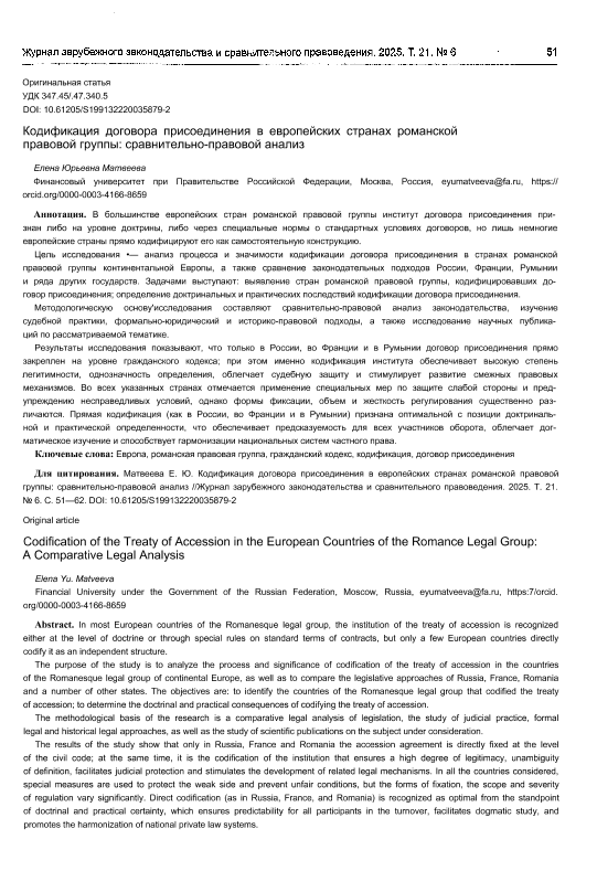 Матвеева, Е.Ю. Кодификация договора присоединения в европейских странах романской правовой группы: сравнительно-правовой анализ // Журнал зарубежного законодательства и сравнительного правоведения. – 2025. – № 6. — С. 51-62. — Хранение – Щербаковская, 38. — <URL:http://elib.fa.ru/art2025/bv1377.pdf>.