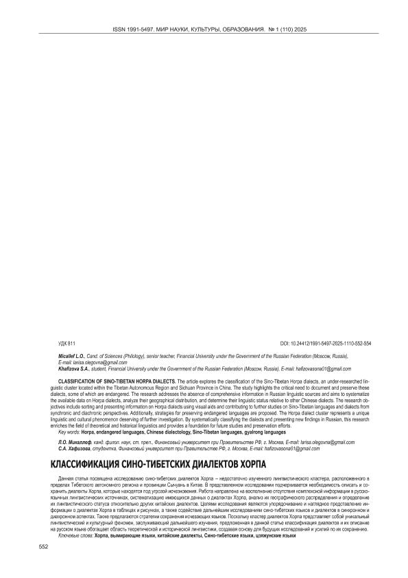 Микаллеф, Л.О. Классификация сино-тибетских языков Хорпа / Л.О. Микаллеф, С.А. Хафизова // Мир науки, культуры, образования. – 2025. – № 1. — С. 552-554. — Только в электронном виде. — <URL:http://elib.fa.ru/art2025/bv1378.pdf>.