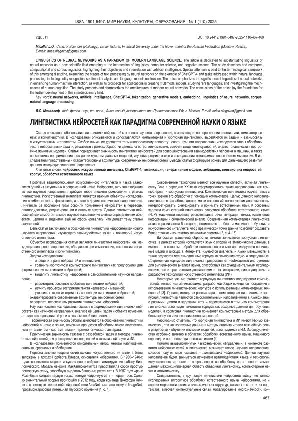 Микаллеф, Л.О. Лингвистика нейросетей как парадигма современной науки о языке // Мир науки, культуры, образования. – 2025. – № 1. — С. 467-469. — Только в электронном виде. — <URL:http://elib.fa.ru/art2025/bv1379.pdf>.