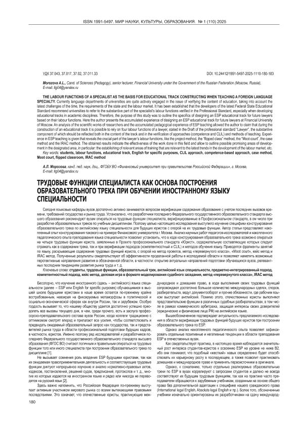 Морозова, А.Л. Трудовые функции специалиста как основа построения образовательного трека при обучении иностранному языку специальности // Мир науки, культуры, образования. – 2025. – № 1. — С. 180-183. — Только в электронном виде. — <URL:http://elib.fa.ru/art2025/bv1380.pdf>.