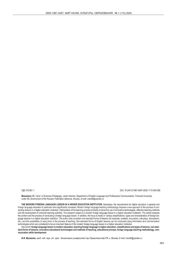 Мусаелян, И.Ф. Современный урок иностранного языка в вузе // Мир науки, культуры, образования. – 2025. – № 1. — С. 363-368. — Только в электронном виде. — <URL:http://elib.fa.ru/art2025/bv1381.pdf>.