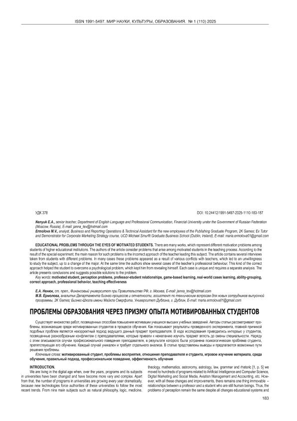 Nenyuk E.A. (Ненюк Е.А.). Educational Problems through the Eyes of Motivated Students = Проблемы образования через призму опыта мотивированных студентов / Nenyuk E.A. (Ненюк Е.А.), Ermolova M.V. (Ермолова М.В.) // Мир науки, культуры, образования. – 2025. – № 1. — С. 183-187. — Только в электронном виде. — <URL:http://elib.fa.ru/art2025/bv1383.pdf>.