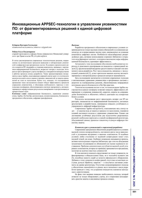Кубарева, В.Е. Инновационные APPSEC-технологии в управлении уязвимостями ПО: от фрагментированных решений к единой цифровой платформе / В.Е. Кубарева, О.В. Рябова // Инновации и инвестиции. – 2025. – № 5. — С. 551-554. — Только в электронном виде. — <URL:http://elib.fa.ru/art2025/bv1726.pdf>.