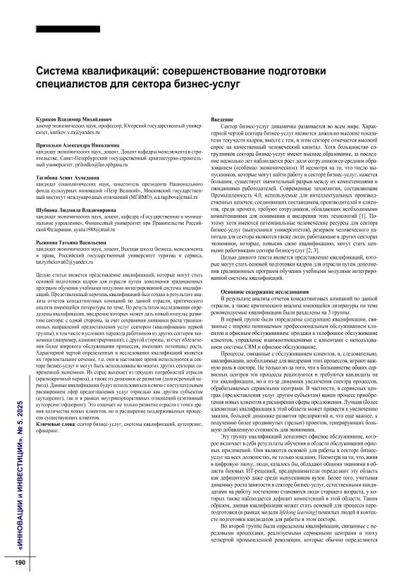Система квалификаций: совершенствование подготовки специалистов для сектора бизнес-услуг / В.М. Куриков, А.Н. Приходько, А.А. Тагибова [и др.] // Инновации и инвестиции. – 2025. – № 5. — С. 190-193. — Только в электронном виде. — <URL:http://elib.fa.ru/art2025/bv1729.pdf>.