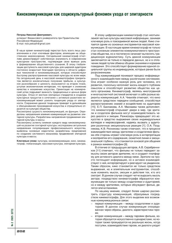 Петраш, Н.Д. Кинокоммуникации как социокультурный феномен ухода от элитарности // Социально-гуманитарные знания. – 2025. – № 2. — С. 202-206. — Только в электронном виде. — <URL:http://elib.fa.ru/art2025/bv2572.pdf>.