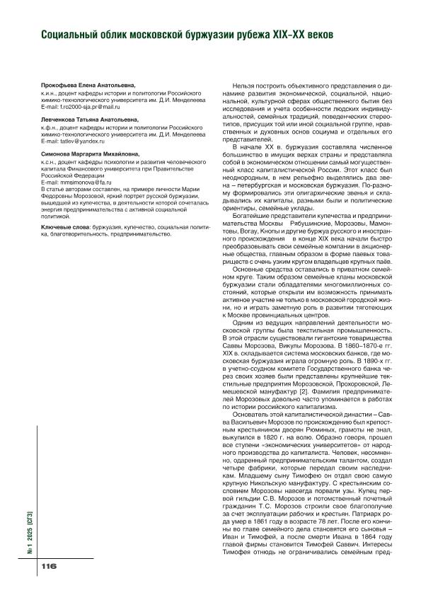 Прокофьева, Е.А. Социальный облик московской буржуазии рубежа XIX–XX веков / Е.А. Прокофьева, Т.А. Левченкова, М.М. Симонова // Социально-гуманитарные знания. – 2025. – № 1. — С. 116-119. — Только в электронном виде. — <URL:http://elib.fa.ru/art2025/bv2576.pdf>.