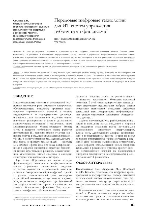 Алтынова, Е.Н. Передовые цифровые технологии для ИТ-систем управления публичными финансами // Риск: ресурсы, информация, снабжение, конкуренция. – 2025. – С. 157-162. — Хранение – Олеко Дундича, 23. — <URL:http://elib.fa.ru/art2025/bv333.pdf>.