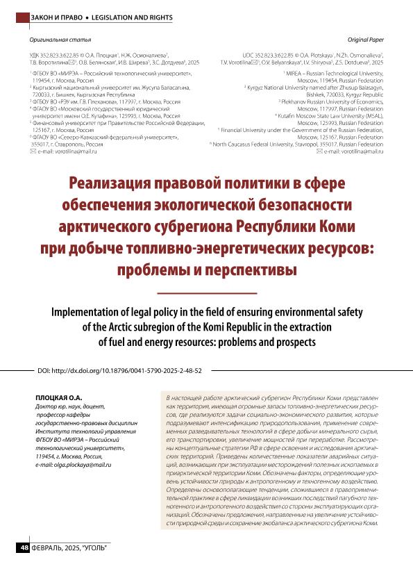 Реализация правовой политики в сфере обеспечения экологической безопасности арктического субрегиона Республики Коми при добыче топливно-энергетических ресурсов: проблемы и перспективы / О.А. Плоцкая, Н.Ж. Осмоналиева, Т.В. Воротилина [и др.] // Уголь. – 2025. – № 2. — С. 48-52. — Только в электронном виде. — <URL:http://elib.fa.ru/art2025/bv708.pdf>.