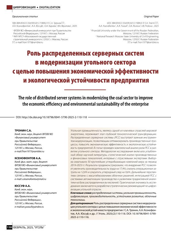 Роль распределенных серверных систем в модернизации угольного сектора с целью повышения экономической эффективности и экологической устойчивости предприятия / С.А. Тронин, А.А. Ксенофонтов, А.А. Юссуф [и др.] // Уголь. – 2025. – № 2. — С. 110-118. — Только в электронном виде. — <URL:http://elib.fa.ru/art2025/bv709.pdf>.