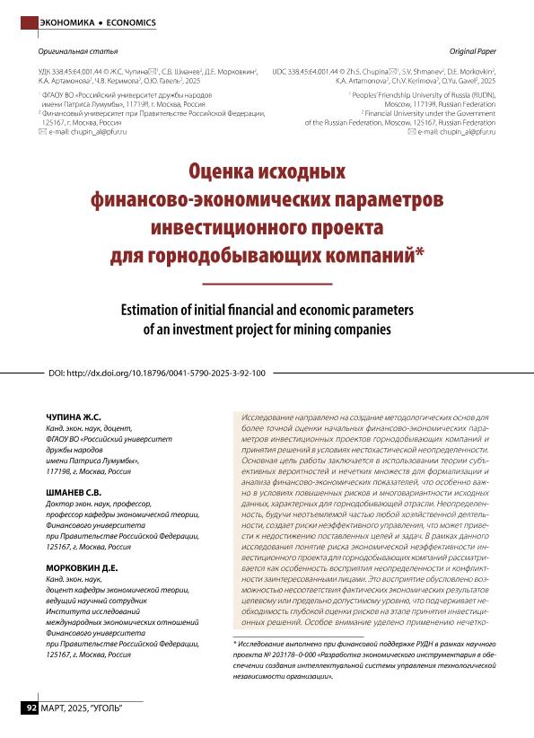 Оценка исходных финансово-экономических параметров инвестиционного проекта для горнодобывающих компаний / Ж.С. Чупина, С.В. Шманев, Д.Е. Морковкин [и др.] // Уголь. – 2025. – № 3. — С. 92-100. — Только в электронном виде. — <URL:http://elib.fa.ru/art2025/bv710.pdf>.