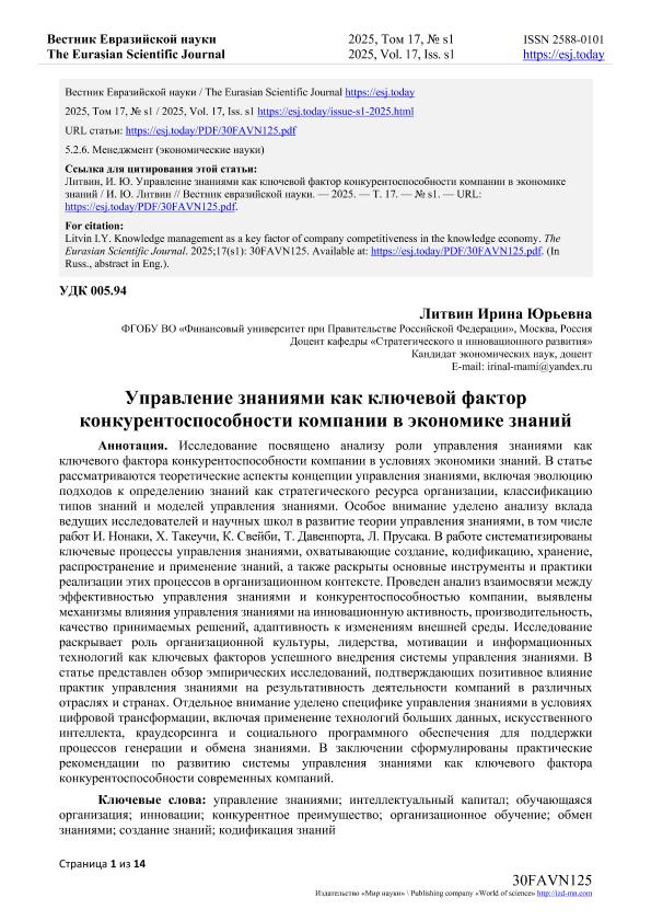 Литвин, А.Ю. Управление знаниями как ключевой фактор конкурентоспособности компании в экономике знаний. — Текст: электронный // Вестник Евразийской науки. – 2025. – № s1. — URL: https://esj.today/PDF/30FAVN125.pdf (дата обращения: 29.09.2025) — <URL:http://elib.fa.ru/art2025/bv896.pdf>.