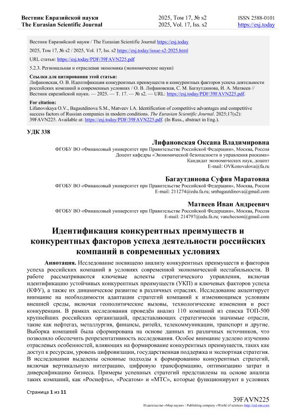 Лифановская, О.В. Идентификация конкурентных преимуществ и конкурентных факторов успеха деятельности российских компаний в современных условиях / О.В. Лифановская, С.М. Багаутдинова, И.А. Матвеев. — Текст: электронный // Вестник Евразийской науки. – 2025. – № s2. — URL: https://esj.today/PDF/39FAVN225.pdf (дата обращения: 27.10.2025) — <URL:http://elib.fa.ru/art2025/bv897.pdf>.