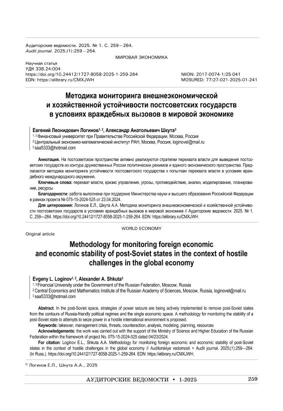 Логинов, Е.Л. Методика мониторинга внешнеэкономической и хозяйственной устойчивости постсоветских государств в условиях враждебных вызовов в мировой экономике / Е.Л. Логинов, А.А. Шкута // Аудиторские ведомости. – 2025. – № 1. — С. 259-264. — Только в электронном виде. — <URL:http://elib.fa.ru/art2025/bv898.pdf>.