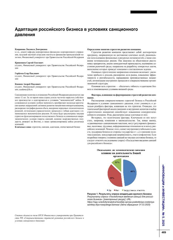 Адаптация российского бизнеса в условиях санкционного давления / Л.Д. Капранова, С.О. Кривеншев, Е.П. Горбачев, А.П. Коншин // Инновации и инвестиции. – 2025. – № 5. — С. 469-473. — Только в электронном виде. — <URL:http://elib.fa.ru/art2025/bv1718.pdf>.