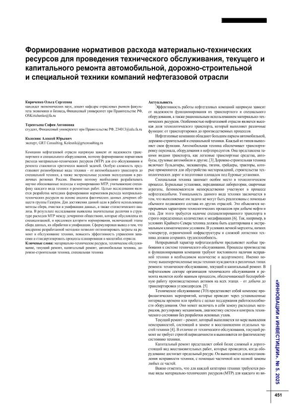 капитального ремонта автомобильной, дорожно-строительной и специальной техники компаний нефтегазовой отрасли / О.С. Кириченко, С.А. Терентьева, А.Ю. Колесник // Инновации и инвестиции. – 2025. – № 5. — С. 451-454. — Только в электронном виде. — <URL:http://elib.fa.ru/art2025/bv1722.pdf>.