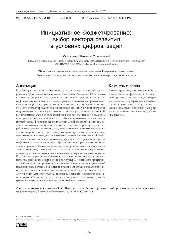 Сергиенко, Н.С. Инициативное бюджетирование: выбор вектора развития в условиях цифровизации // Вестник университета. – 2025. – № 5. — С. 190-199. — Только в электронном виде. — <URL:http://elib.fa.ru/art2025/bv1447.pdf>.